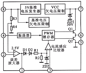 内设过流保护输入(第3脚)和误差放大输入(第1脚)两个脉冲调制(PWM)控制端。误差放大器输入端构成主脉宽调制(PWM)控制系统,过流检测输入可对脉冲进行逐个控制,直接控制每个周期的脉宽,使输出电压调整率达到0.01%/V。如果第3脚电压大于1V或第1脚电压小于1V,脉宽调制比较器输出高电平使锁存器复位,直到下一个脉冲到来时才重新置位。如果利用第1、3脚的电平关系,在外电路控制锁存器的开/闭,使锁存器每个周期只输出一次触发脉冲,无疑使电路的抗干扰性增强,开关管不会误触发,可靠性将得以提高。