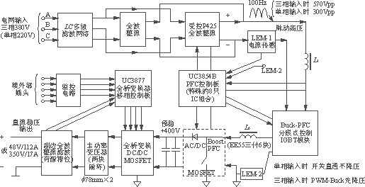 从实体解剖、拆焊绘制48V/70A通信电源和350V/10A特种电源主板上的所有元器件、印制板铜箔正反两面实际走线、众多焊点的真实定位(有的穿孔、有的并不穿孔只在单面),由此绘出的图1主功率变换电路图,以及图2电源总结构框图与PFC、全桥控制板相互关系,看出一个总体规律。
