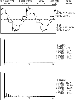 测量打印的电网输入波形、电流频谱(省略了电压频谱)
