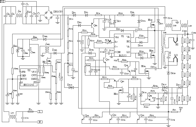 高频镇流器电路采用了集成电路驱动芯片IR2153,它能提供两路非常干净的可驱动半桥逆变电路中上下两个MOSFET功率开关管的信号。