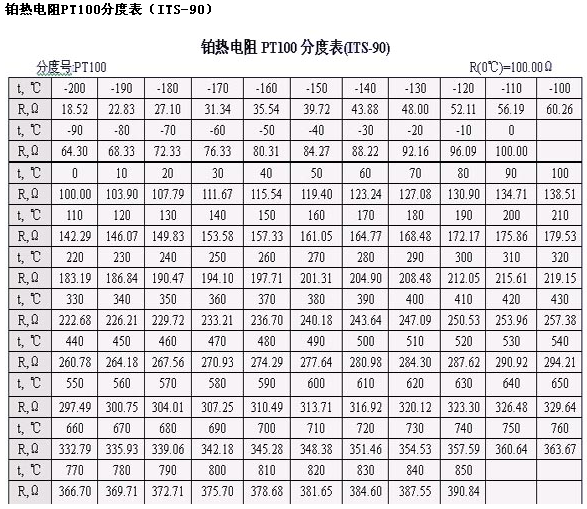 Pt100分度表可以简单实现Pt100温度值-热电势值之间和铂电阻电阻值值-温度值之间的互换查询,Pt100分度表也称为Pt100铂电阻分度表,属于热电阻分度表之一。