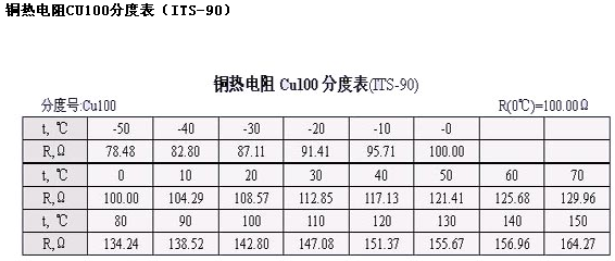 热电阻分度表的行:从第四行第二列起为100度的整数倍的温度下对应的热电动势,而第三行起是0到90度温度下对应的热电动势。