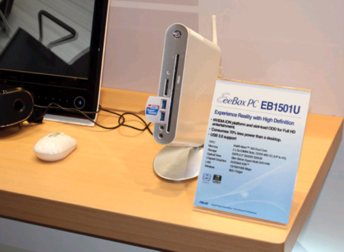 除了铝壳Eee PC外,华硕在CeBIT上还展示了 Eee Box EB1501 型号的超便携PC,它被定位为一个家庭影院电脑,新版添加了两个USB3.0高速接口,采用NVIDIA Ion结构,内置一颗双核1.6GHz Atom,2GB内存,250-320GB硬盘可选,支持Wi-Fi,有HDMI和VGA输出,六个USB接口,一个eSATA接口,5合1读卡器,双层DVD刻录机也成为标配。此外,采用800MHz三星处理器的更纯粹的家庭影院PC - EeeMedia EM0501也刚刚被展示出来,它的功耗仅有10W,可轻松回放1080p HD视频。