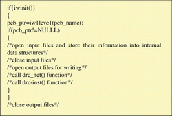 这里,iwinit()和iw1level()是ViewBase例程。前者初始化全部载入例程(这也是必须的),而后者则载入整个PCB设计。为了保证只载入一张电路图,可以调用iw1sheet()例程(本文的DRC工具并不使用该例程)。需要注意的是,正确的设计指针、文件指针、链接列表、变量名称等必须传入drc_net()和drc_inst()函数: