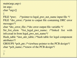 当DRC封装程序激活DRC时,将导入输入和输出文件名及PCB设计名 (参见3.0.1节)。数据结构Str_list_elem和Hash_table定义在drc.c包含的头文件中,而GROUPS则是ViewBase数据类型。