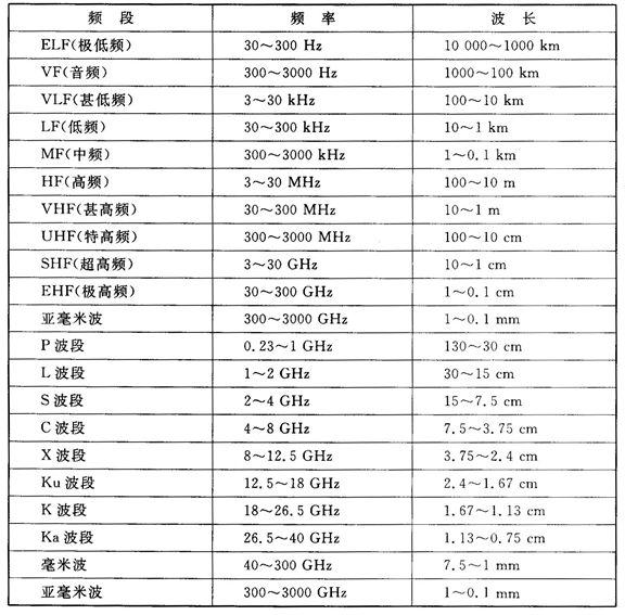 一般情况下,射频/微波频段分为 米波(10-1m,30-300MHz),分米波(波长10~1dm,频率300~3000MHz)、 厘米波(波长10~1cm,频率3~30GHz)和毫米波(波长10~1mm,频率30~300GHz)四个波段。